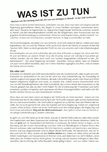 Entweder wir Metaller und IGM Gewerkschafter sind die Gewerkschaft, oder es gibt sie nicht. Entweder wir erkämpfen in ihr und mit Ihr nicht nur eine Lohnerhöhung, die zweistellig ist und die zugleich sich gegen die Inflation, die jede Lohnerhöhung wegfrisst und raubt, zu wenden hat. Indem unsere Gewerkschaft nicht nur von den Metallkapitalisten das Geld zurückholt, das unsere Arbeit den Ausbeutern in die Tresore gespült hat, das sie dann nicht haben für die Erweiterung der Produktion und dafür einsetzen, sondern verspielen und verprassen mit ihren Finanzgeschäften und dafür sich Milliarden darüber hinaus aus den Staatskassen nehmen.Ohne dass wir dem jetzt schon am Beginn der Tarifrunde ein Ende bereiten - indem wir ihre Wucherpreise durch die Geldentwertung in der Tarifrunde stoppen, gibt es kein Auskommen für uns und unsere Familien. Die Tarifrunde ist zugleich so zu führen, dass die Inflation der bezahlt, der sie auch gemacht hat. Also das Kapital und seine Regierung. Indem wir umgehend unsere Löhne sichern, indem wir in der Tarifrunde auch den Kampf gegen die Regierung und ihren Staat aufnehmen. Weg mit der Mehrwertsteuer! - dann gibt es schon mal zur Stunde eine saftige Lohnerhöhung in unserer Lohntüte.